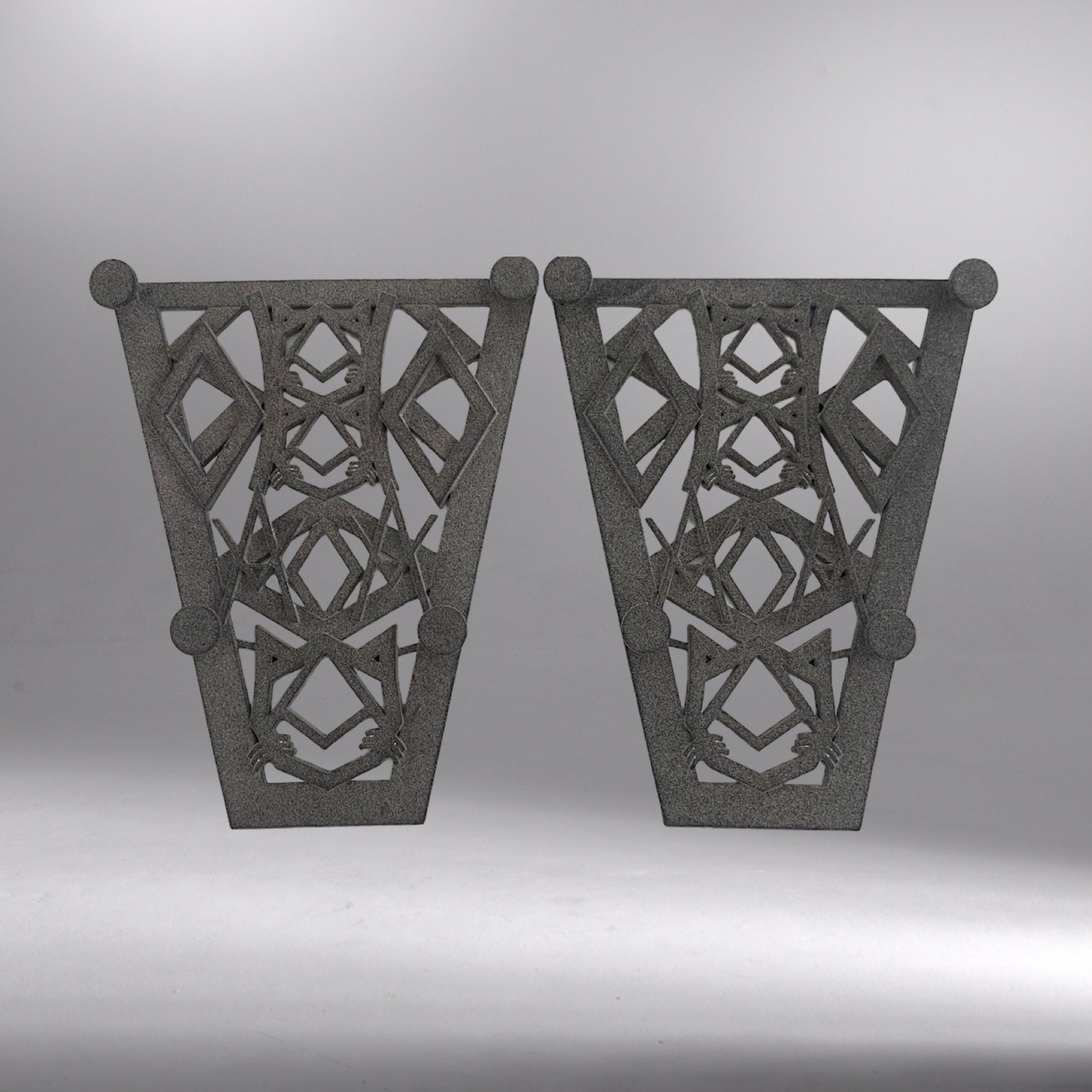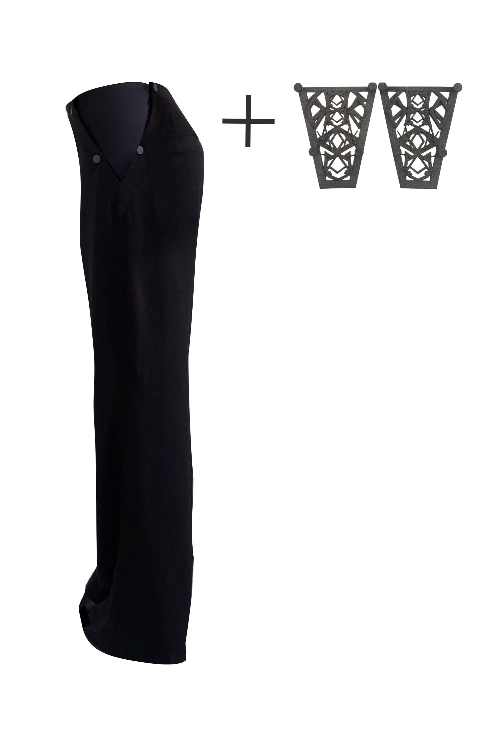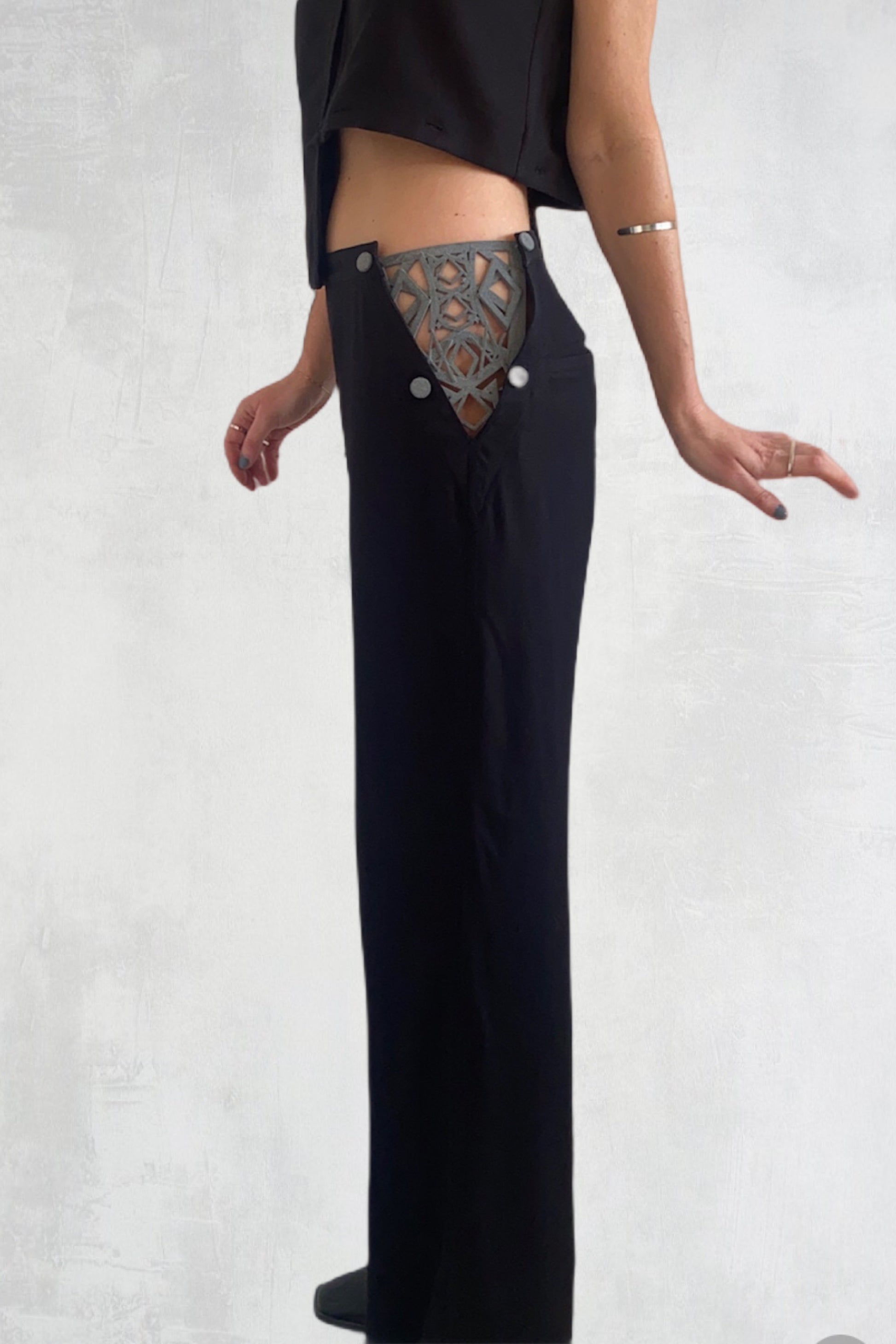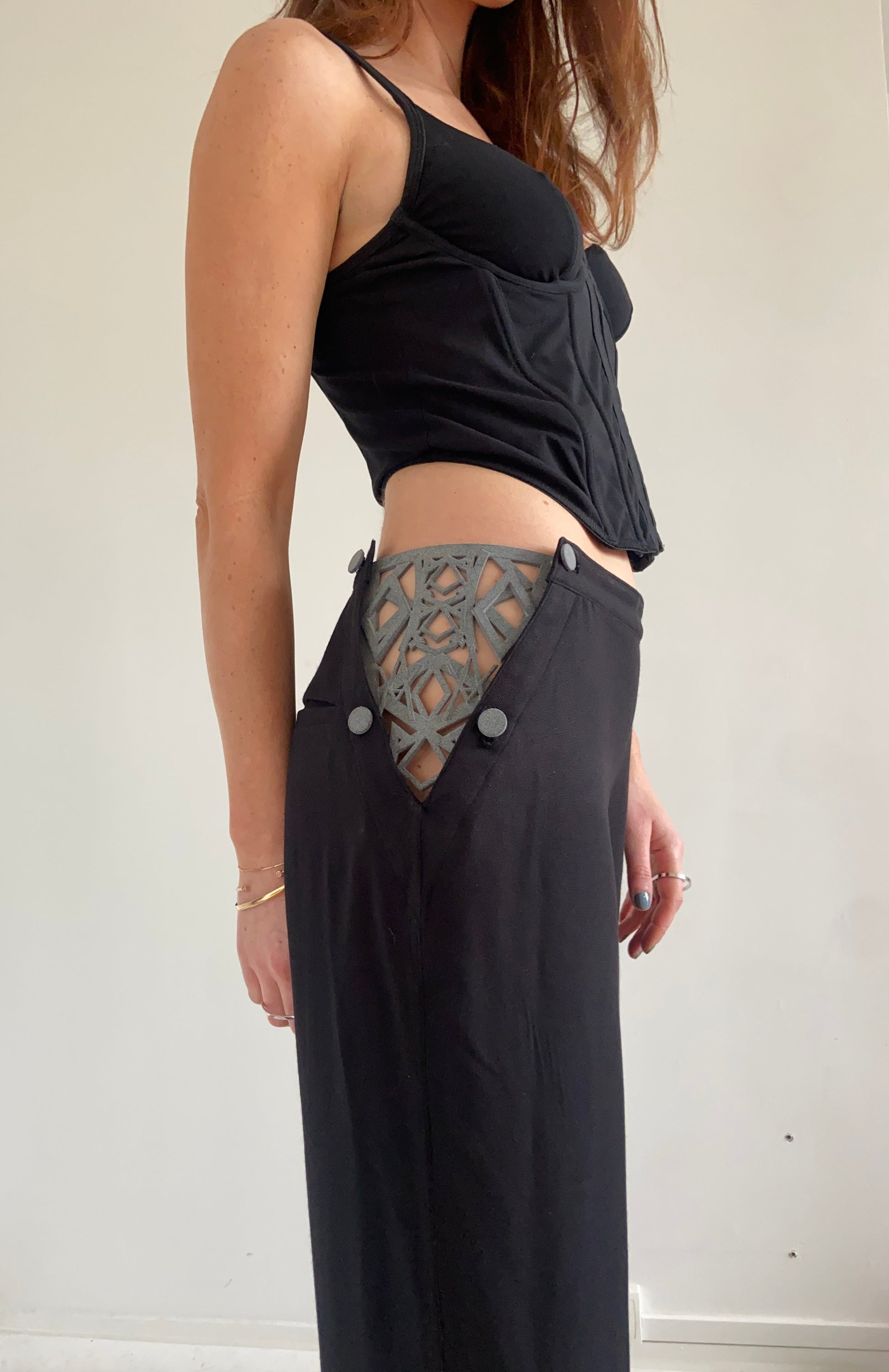 Straight modular black cotton pants with removable hips, and 3D-printed geometric lace pattern hip customization.