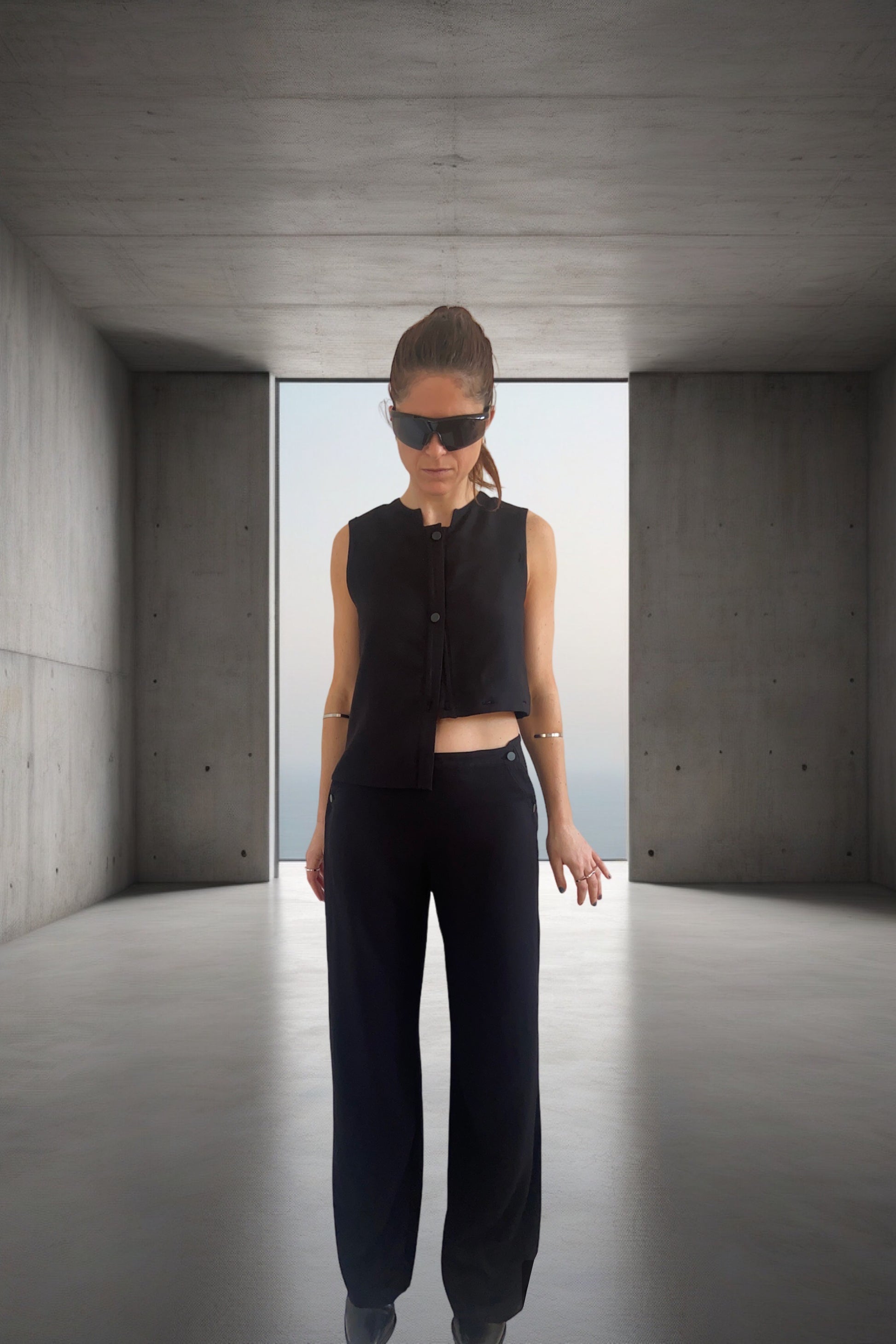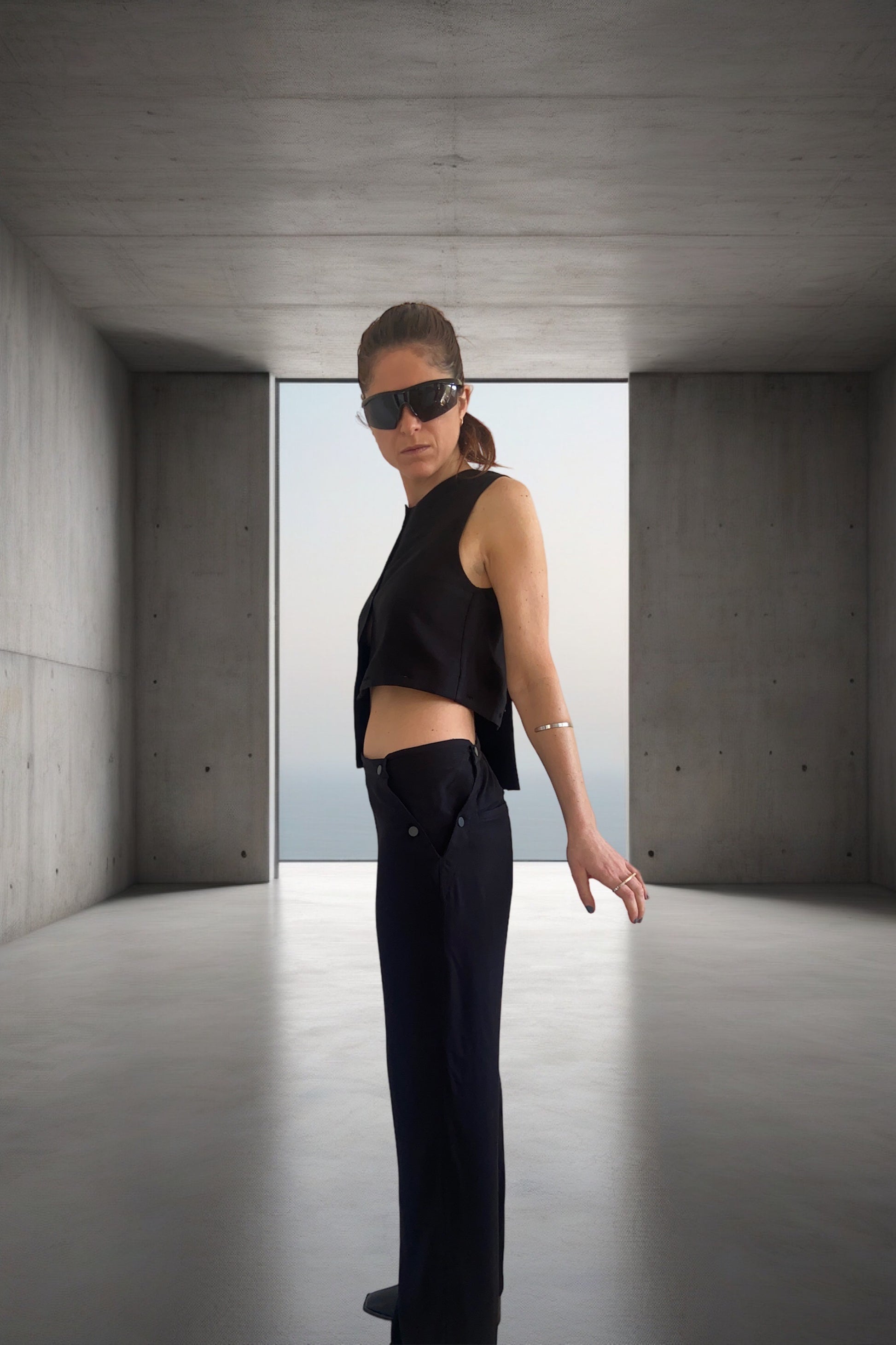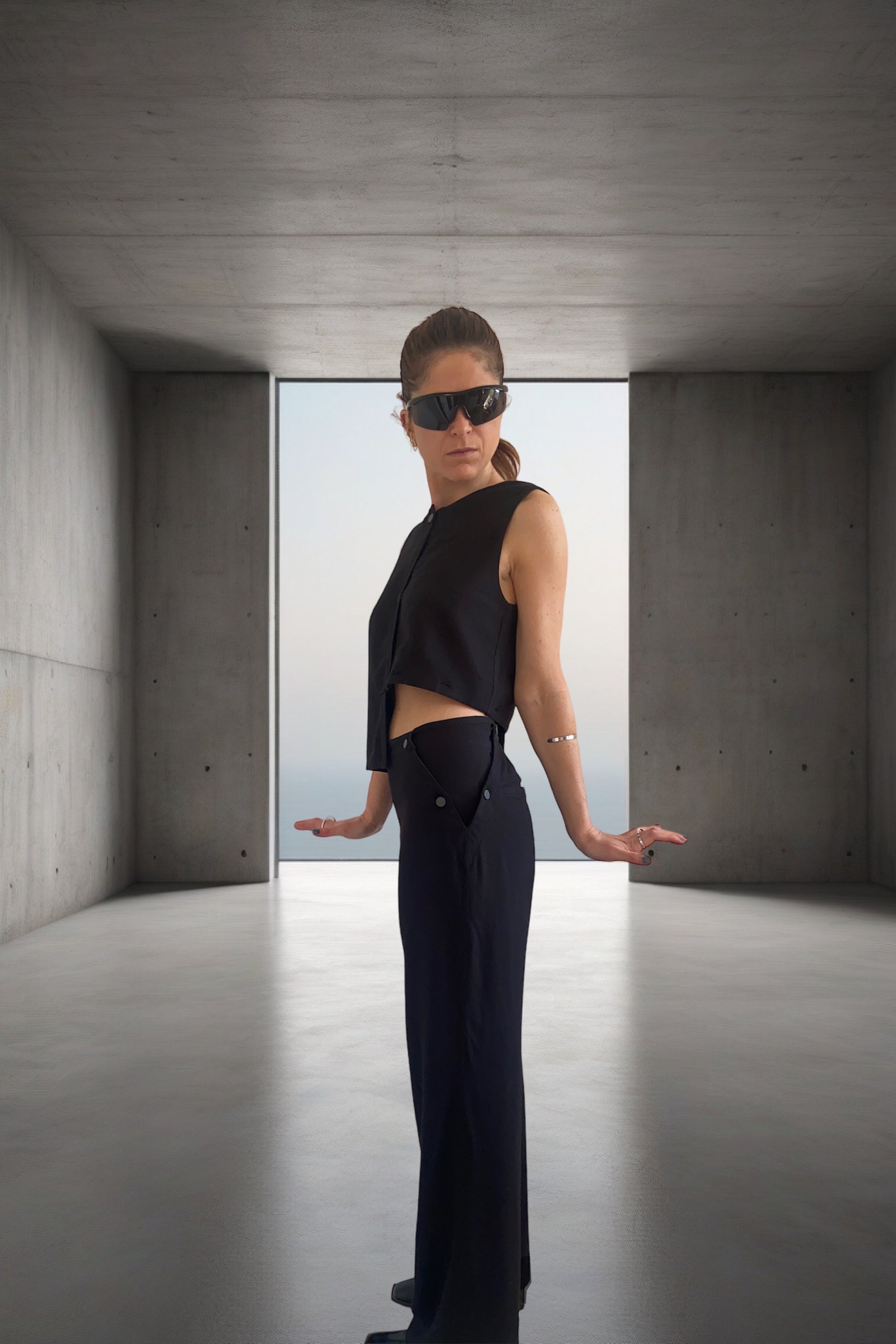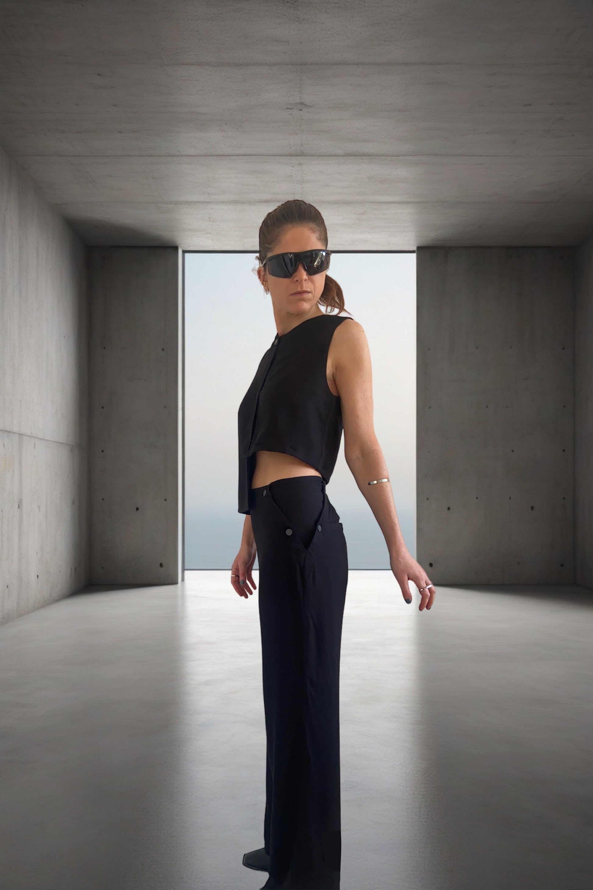 The 3D-printed hips can be used to close and customize the pants. They are easily detached and attached by buttoning, so you can change them as you please to customize your outfit, adapting it to your desires, occasions and morphology.