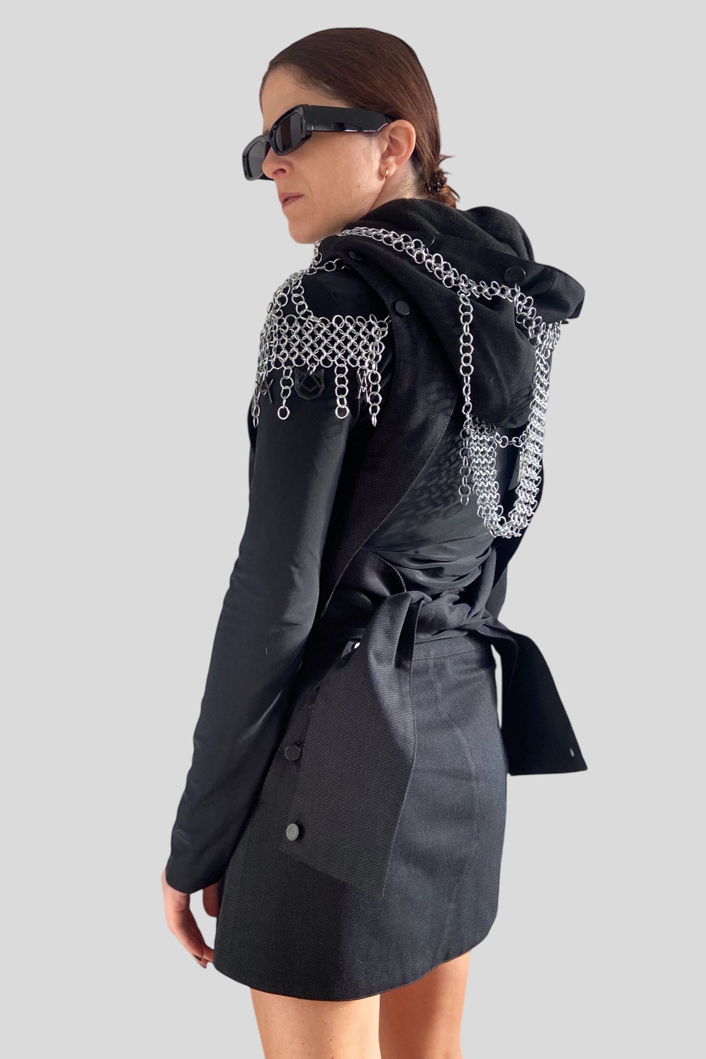 Le hoody s'adapte à vos occasions, vos envies et à votre morphologie. Vous pouvez le fermer différemment grâce à notre système de croisure, et le customiser (manches et capuche) grâce à des pièces originales réalisés via impression 3D et/ou chainettes. Ici fourni avec les manches et la customisation de capuche Archi, réalisées en cotte de maille (anneaux d'aluminium) et impression 3D de TPU et PLA.